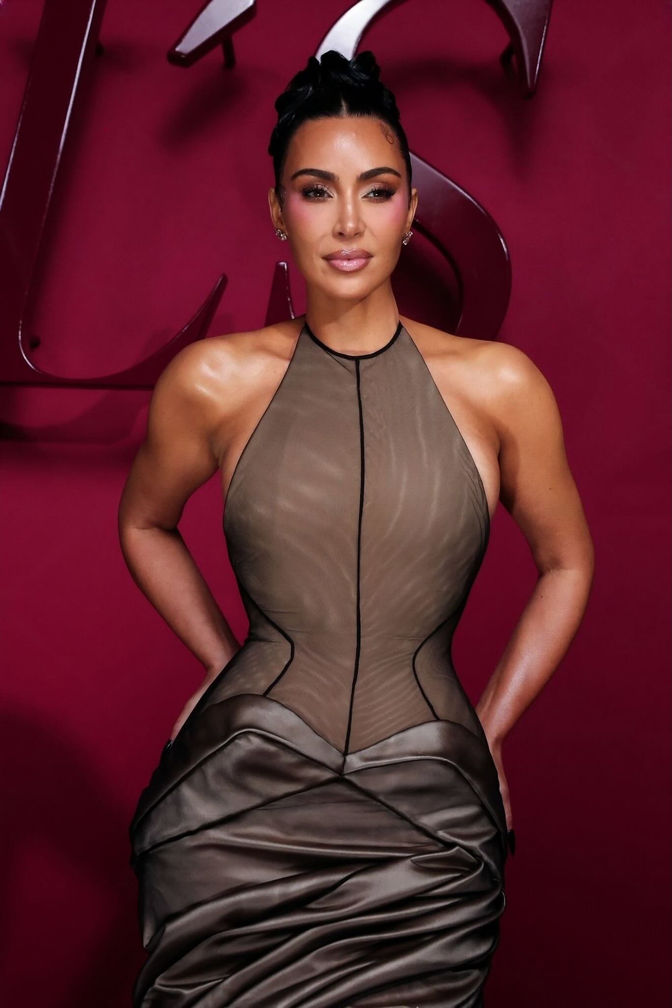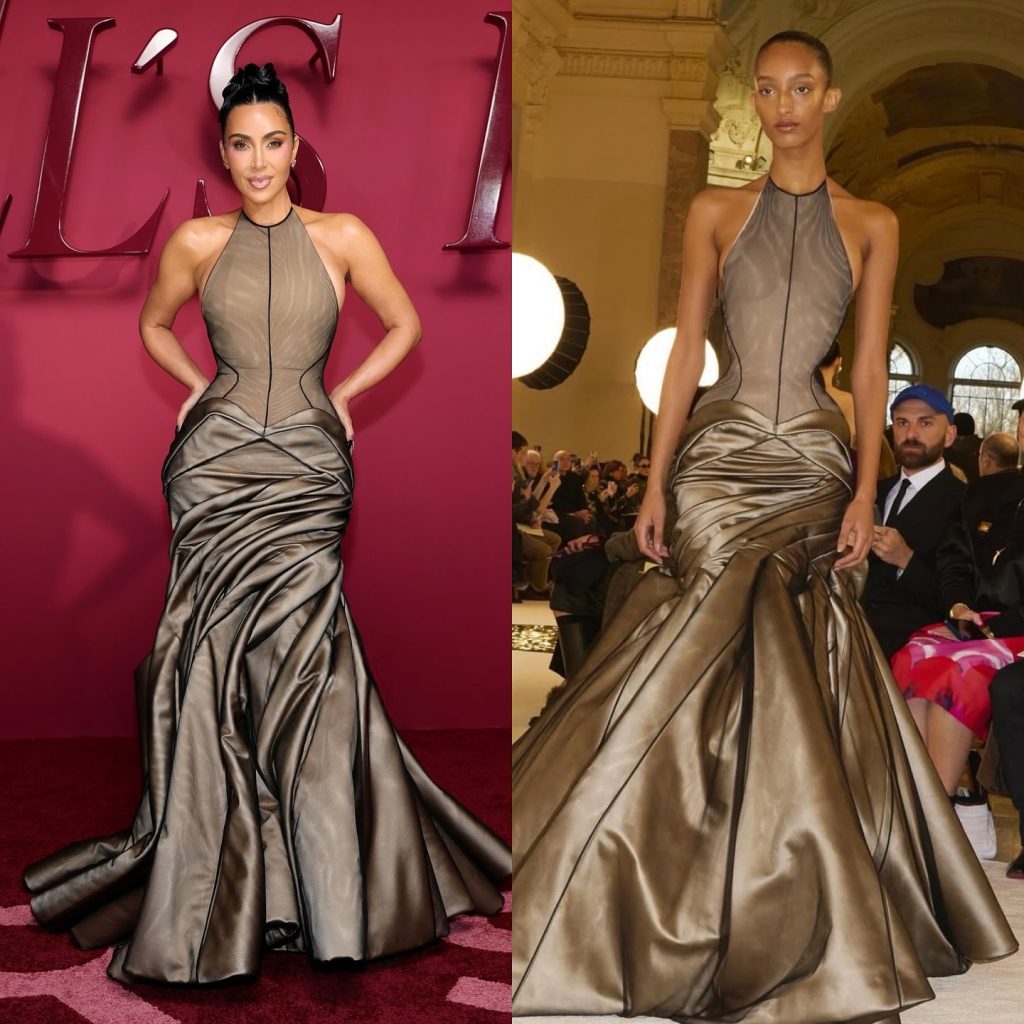 Her gown was couture as narrative: a nude satin base overlaid with sheer black tulle, corsetry exposed, seams visible, the construction itself making a statement. The upper half felt almost “in-progress,” a deliberate peek at the architecture of fashion, while the lower half unfurled into a dramatic, structured skirt—a surrealist’s dream that still screamed power and poise. Styled with a sleek bun, glowing skin, and no distracting jewelry, Kim let the craftsmanship and her aura do all the talking.